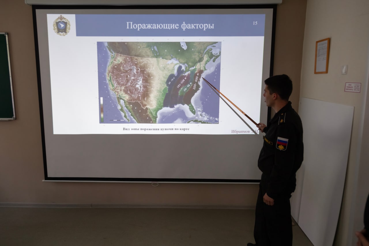Детали. Пресс-релиз о конференции на сайте вуза сопровождается фотографией выступления курсанта (см. ниже). На снимке он стоит рядом с картой США, под которой написано «Вид зоны поражения цунами на карте». В восточной части Северной Америки на карте изображены зоны с подписями «200-490 м» (на побережье Атлантического океана), 20-46 метров (в районе горной системы Аппалачи), 101-228 метров (за горами) и 30-70 метров (ближе к центру континента).