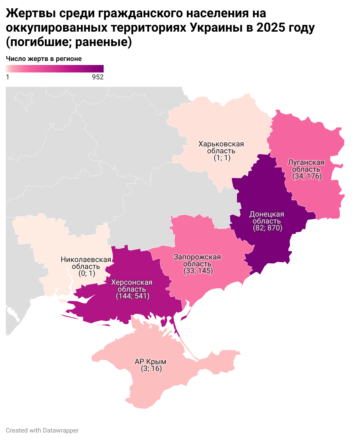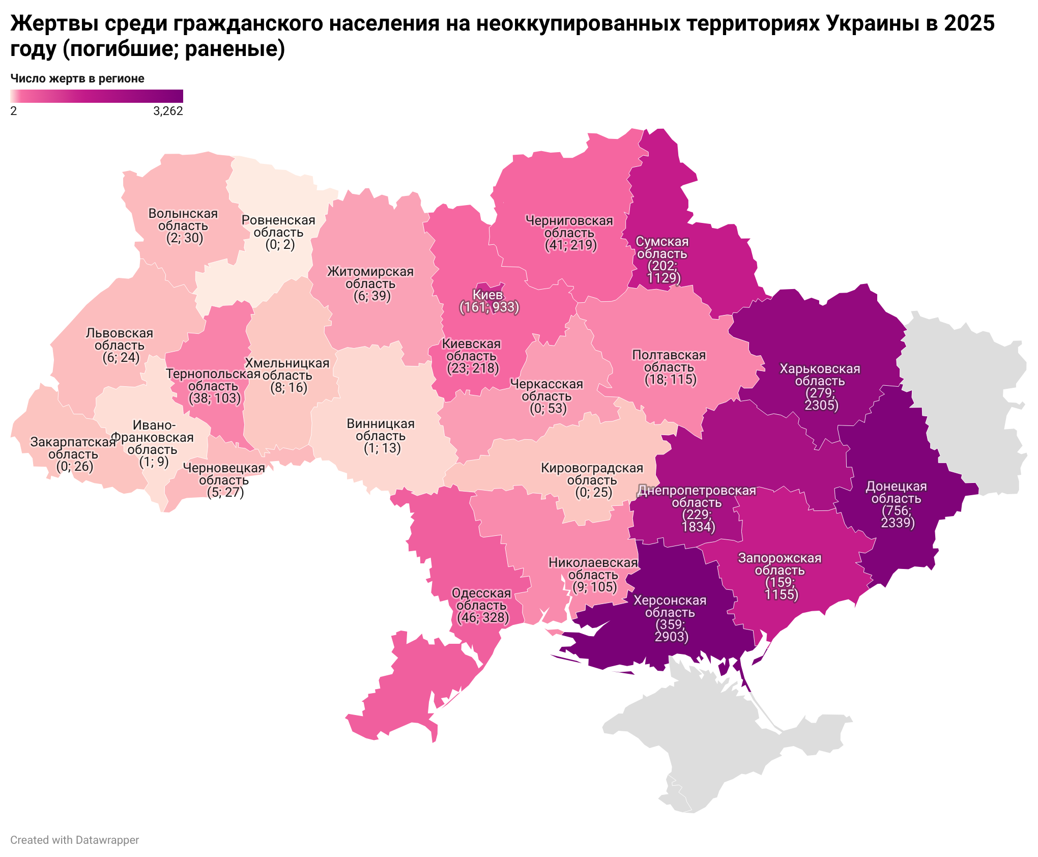 • На подконтрольной Киеву территории больше всего мирных жителей погибли в Донецкой (756 человек), Херсонской (359), Харьковской (279), Днепропетровской (229), Запорожской (159). Если в 2024 году в Украине было три региона, в которых не было зафиксировано ни одного пострадавшего (Ровненская, Черновицкая и Закарпатская области), то в 2025 году таких регионов не было.