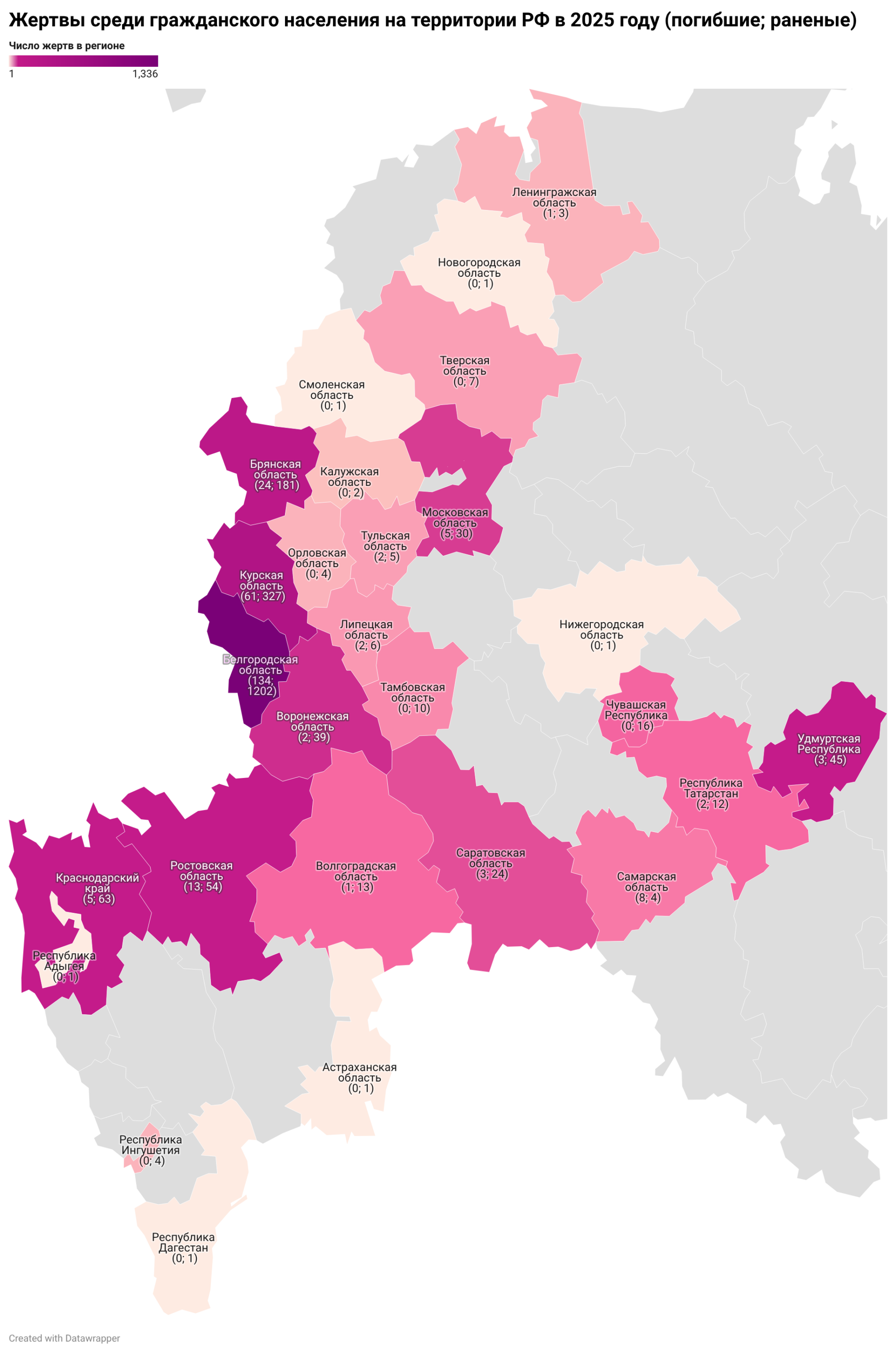 • В России самым пострадавшим от воздушных ударов регионом стала Белгородская область, где погибли 134 человека (это меньше, чем в 2024 году, когда число погибших достигало 176). В Курской области погиб 61 мирный житель, в Брянской области — 24. При подсчете данных по Курской области учитывались только жители, погибшие в результате воздушных атак, сообщили «Агентству» в CIT.