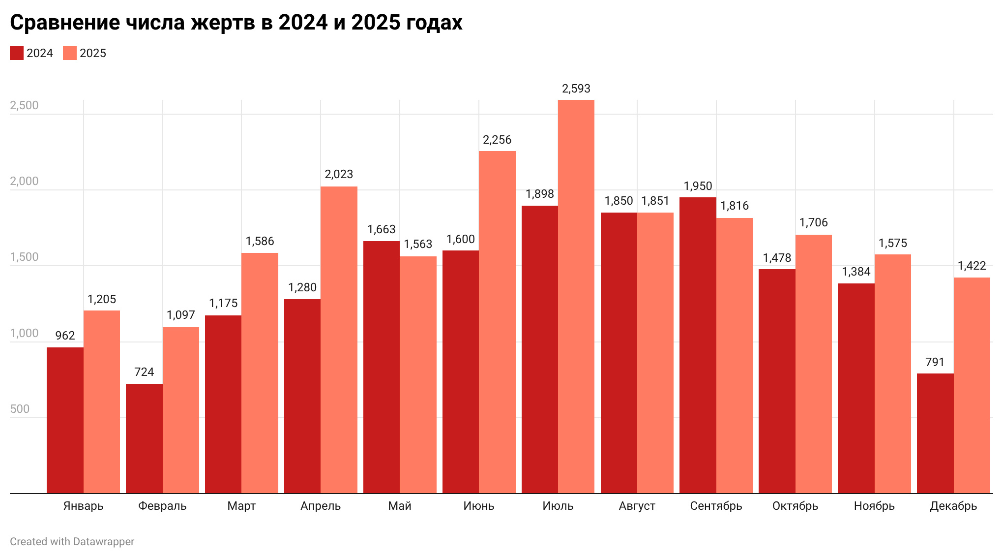 Детали. Больше, чем в 2025 году, жертв среди гражданского населения было только в 2022 году, следует из данных CIT. В этот год проходила в том числе осада Мариуполя, в ходе которой, по данным Human Rights Watch, погибли не меньше 8 тысяч человек.