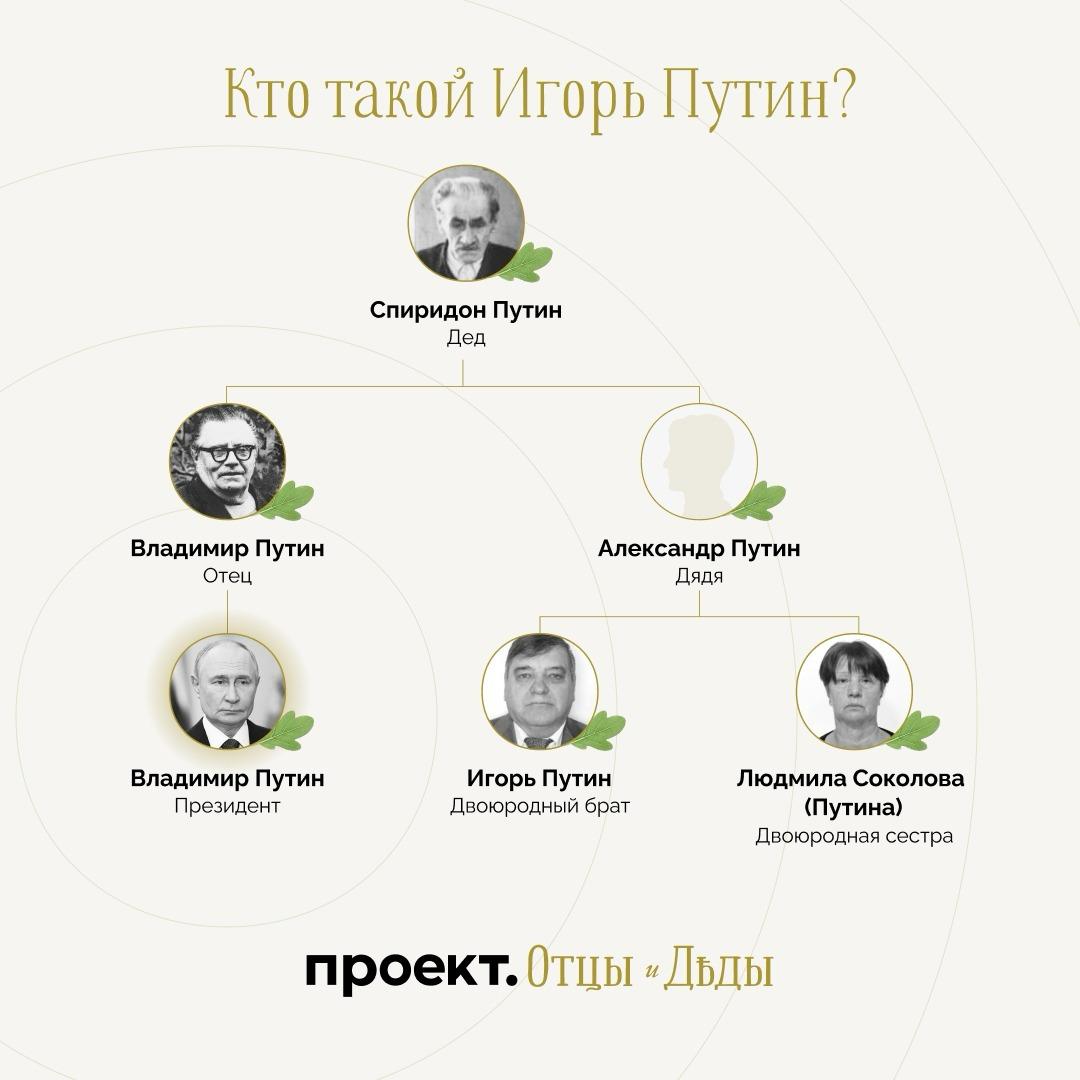Детали. Игорь Путин — двоюродный брат Владимира Путина по «рязанской» линии, сын Александра Спиридоновича Путина — брата отца президента. До 1998 года Игорь Путин служил в армии, после выхода на пенсию пытался сделать карьеру чиновника, занимая небольшие государственные должности в Рязанской области.