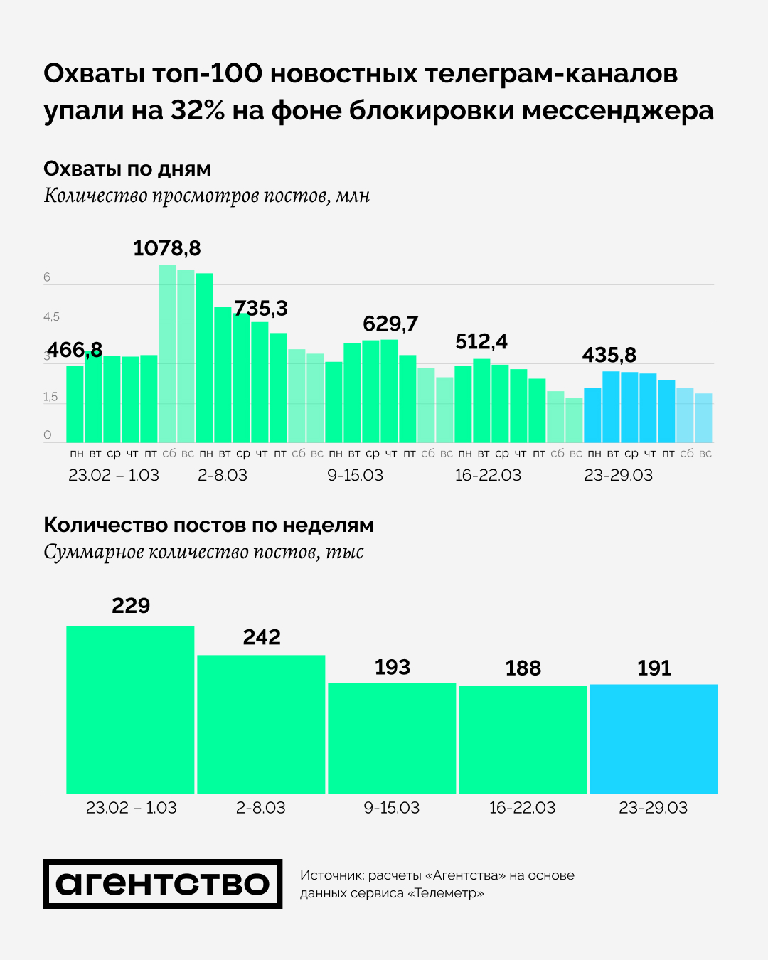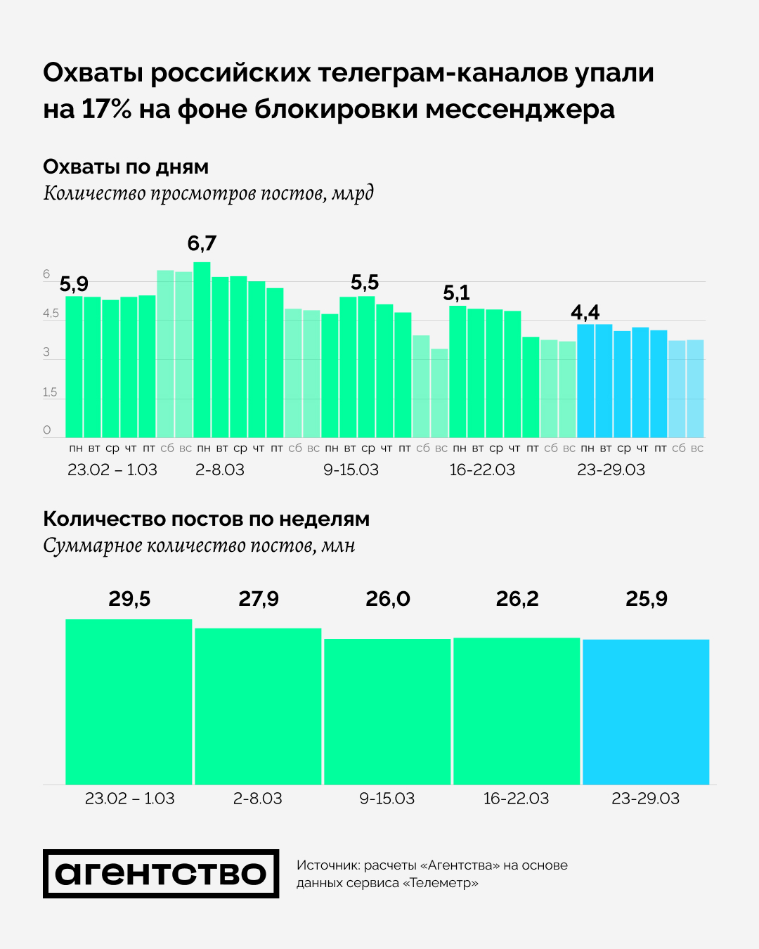 - Количество публикаций в российских телеграм-каналах также снизилось, но менее существенно — со среднего показателя в 27 млн постов в первую неделю февраля до 26 млн на прошлой неделе (-5%).