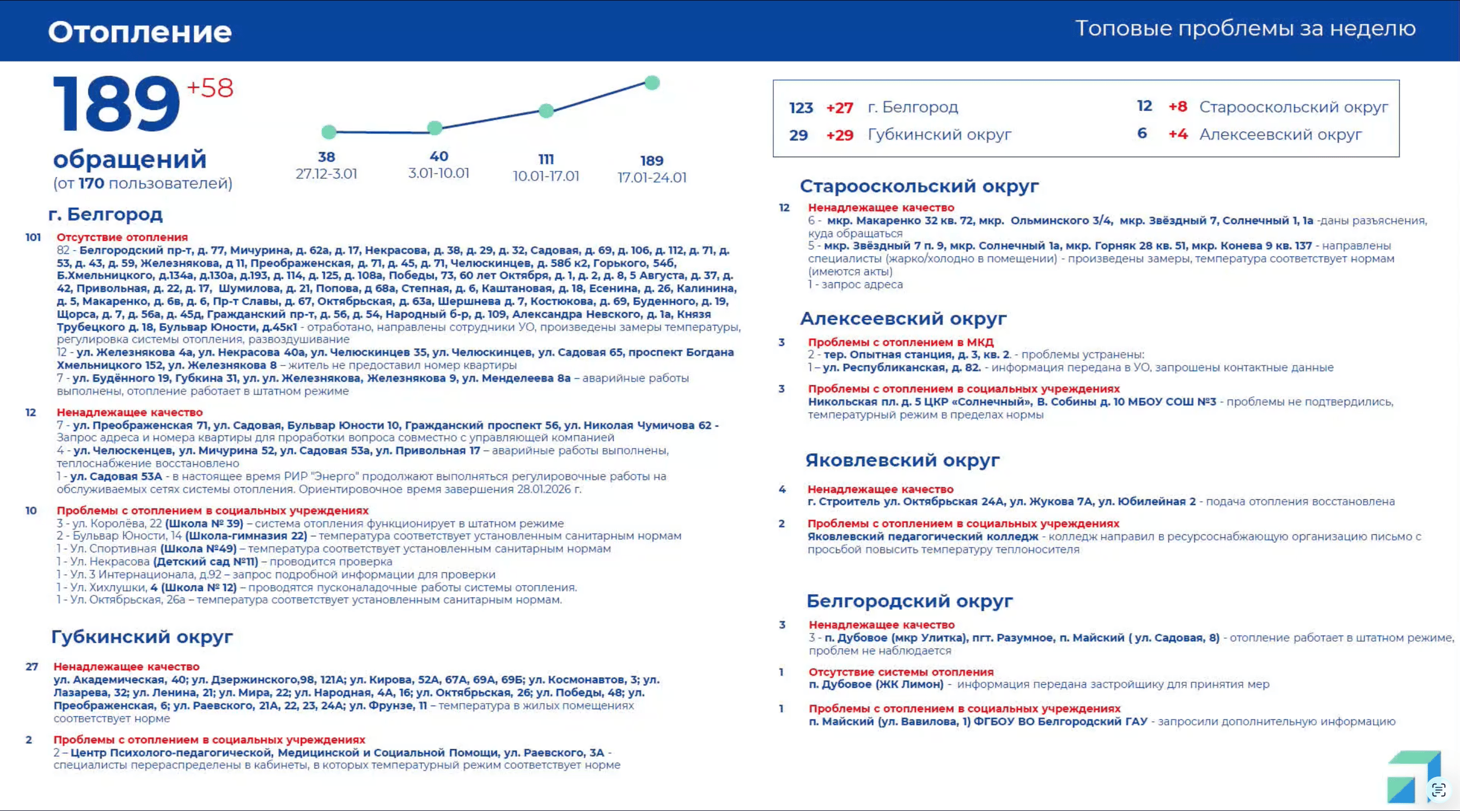 Детали. За прошлую неделю в Белгородской области поступило 189 жалоб на отопление, следует из презентации с результатами мониторинга соцсетей, которую показали на заседании правительства региона. Это на 52% больше, чем на неделе до этого, когда устраняли последствия блэкаута после удара ВСУ 9 января. Тогда местные жители оставили 111 жалоб.