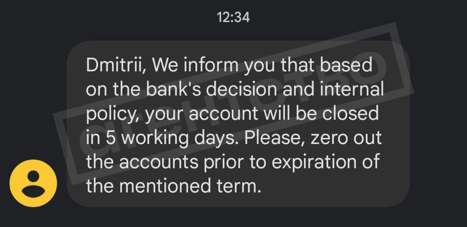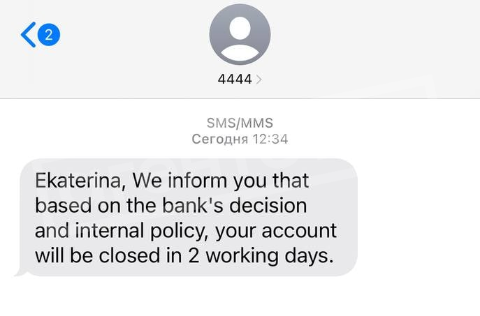 Детали. Судя по рассказам пяти собеседников «Агентства», они все получили однотипные сообщения от службы поддержки банка: «Мы сообщаем вам, что, согласно решению банка и внутренним правилам [банка], ваш счет будет закрыт в течение двух [в некоторых случаях — пяти] рабочих дней».