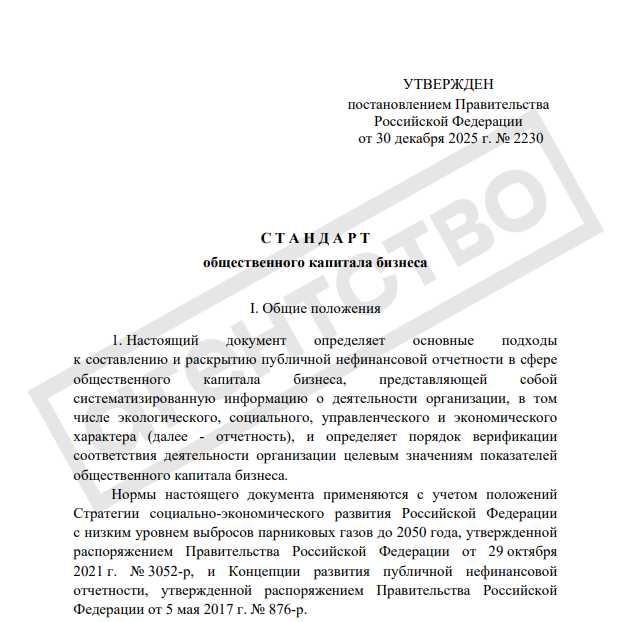 • В постановлении Мишустина о введении стандарта говорится, что его применение «организациями осуществляется на добровольной основе». Постановление определяет «основные подходы к составлению и раскрытию публичной нефинансовой отчетности в сфере общественного капитала бизнеса, представляющей собой систематизированную информацию о деятельности организации, в том числе экологического, социального, управленческого и экономического характера, и определяет порядок верификации соответствия деятельности организации целевым значениям показателей общественного капитала бизнеса».