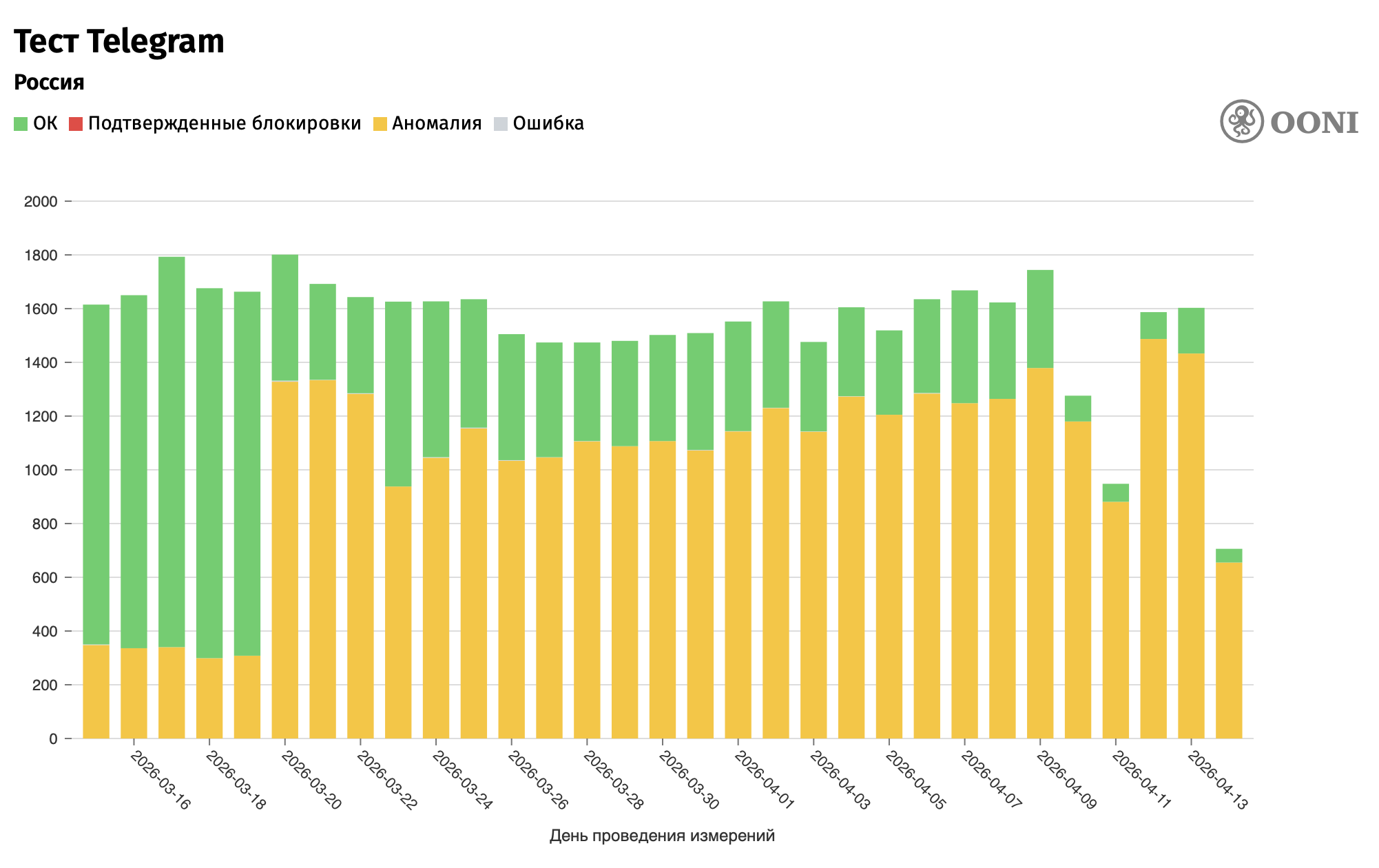 Детали. Доля аномалий в трафике Telegram днем во вторник составила 93%, свидетельствуют данные международного исследовательского проекта OONI. Это даже больше, чем было накануне, когда уровень блокировок опускался до 89% с 94% днем ранее.