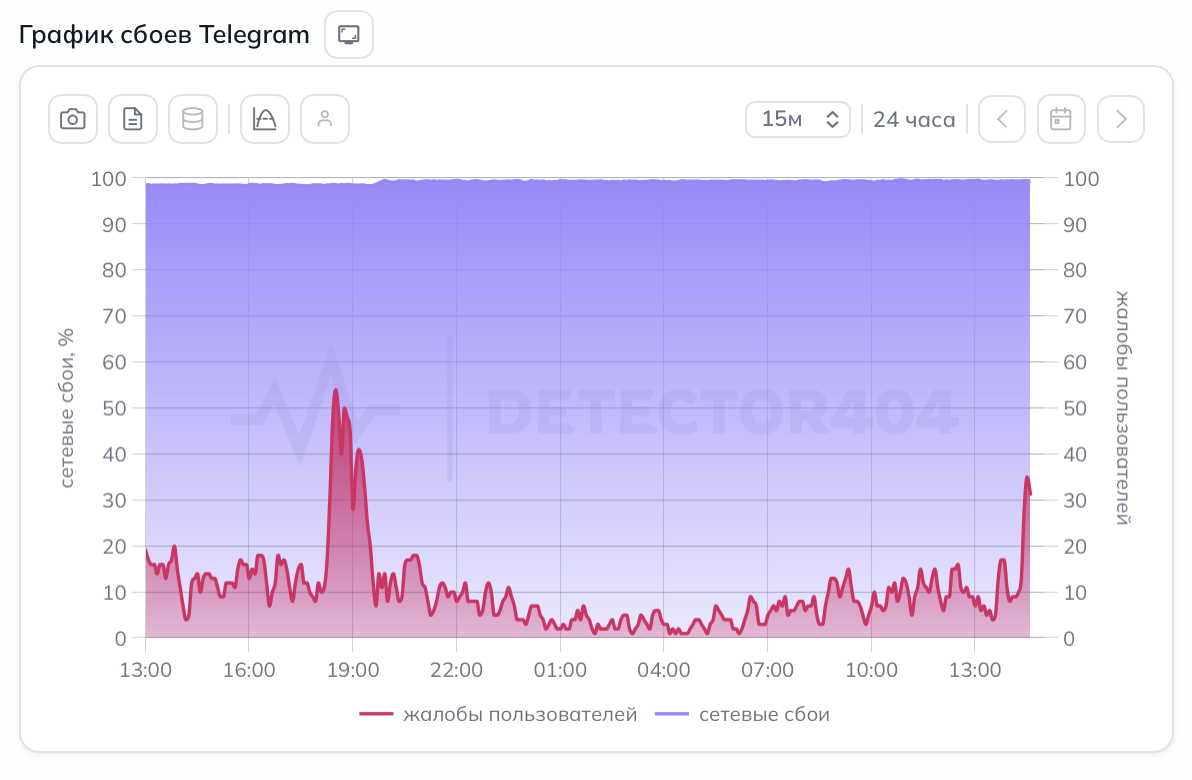 - ️Процент сетевых сбоев, который фиксирует сервис Downdetector, к 14:00 составлял 99%, поднявшись с 98% днем ранее. Более 900 пользователей сервиса за последние сутки пожаловались на проблемы с доступом к мессенджеру. Мониториновый сервис «сбой.рф» к 14:30 вторника получил 285 жалоб на работу Telegram против 808 за весь понедельник.