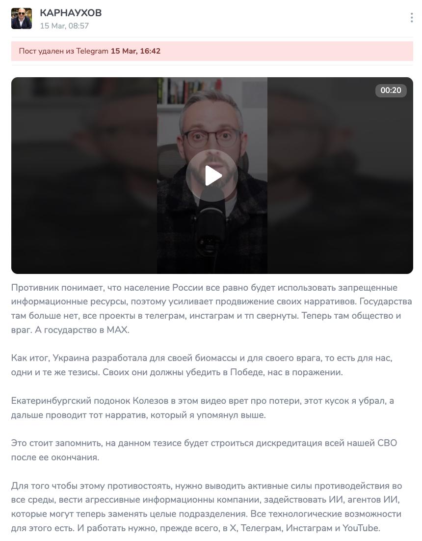 - ️В середине марта ведущий «Соловьев Live» Сергей Карнаухов опубликовал несколько критических постов о блокировках, VPN и информационной политике, но позже удалил их.