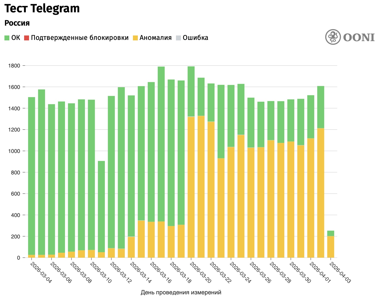 Уровень аномалий при заходе в Telegram утром в пятницу достиг 80%, свидетельствуют данные международного исследовательского проекта OONI. Со среды этот показатель вырос почти на 7 процентных пунктов.