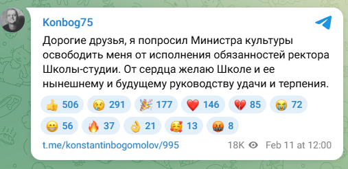 Цитата. «Дорогие друзья, я попросил Министра культуры освободить меня от исполнения обязанностей ректора Школы-студии. От сердца желаю Школе и ее нынешнему и будущему руководству удачи и терпения», — написал Богомолов в своем телеграм-канале.