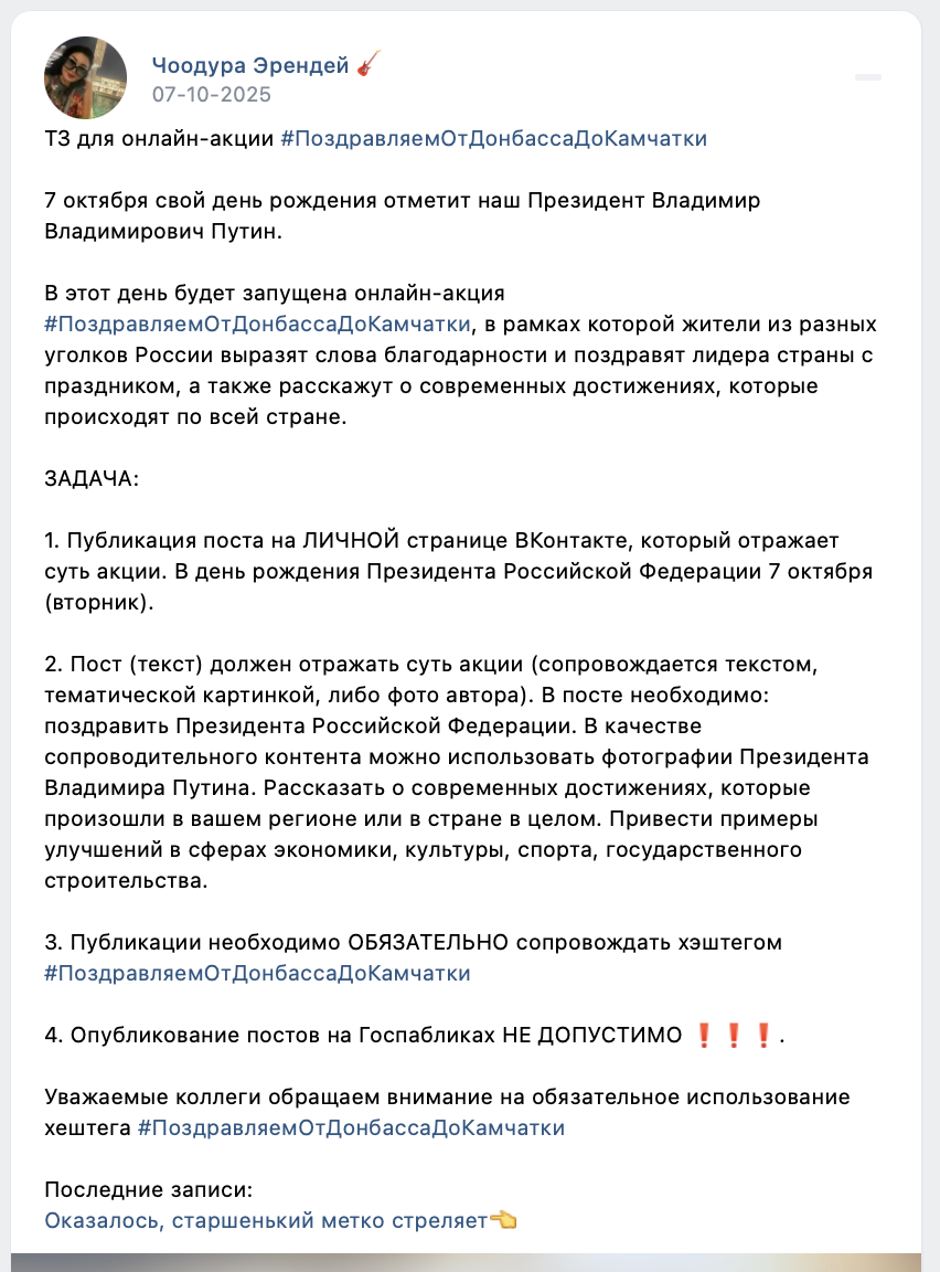 Детали. Эрендей на личной странице во «ВКонтакте» опубликовала «ТЗ для онлайн-акции #ПоздравляемОтДонбассаДоКамчатки». Позже она удалила этот пост со своей стены (доступен в архиве), но оставила в качестве фотографии в фотоальбоме страницы.
