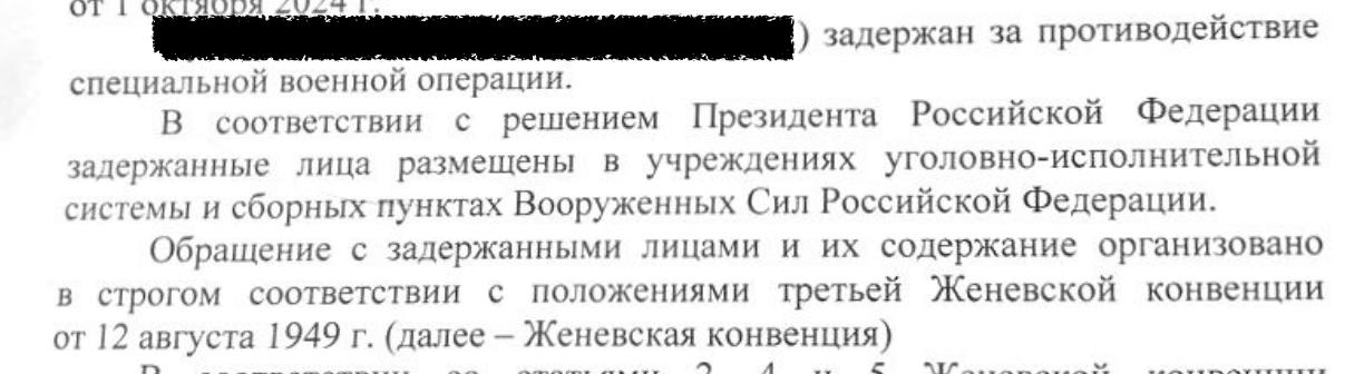 • В распоряжении «Агентства» оказалась выдержка из дела о допуске адвоката к задержанному украинцу. После ссылки на решение Путина в документе говорится, что обращение с задержанными и их содержание соответствует Женевской конвенции о защите гражданского населения во время войны. Полозов сказал, что в известных ему делах Женевская конвенция упоминается редко, в основном в ответах Минобороны на запросы.