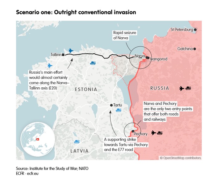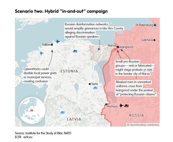 Детали. Эксперты ECFR Дженнифер Кавана и Джереми Шапиро проанализировали два сценария нападения России на Эстонию: обычное вторжение и гибридную операцию, аналогичную действиям в Крыму в 2014 году.