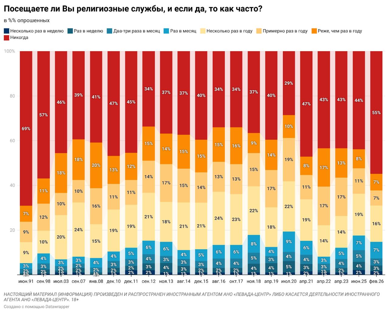 Больше половины россиян (55%) признались, что никогда не посещают религиозные службы, свидетельствует исследование «Левада-Центра». Это первый случай с 1997 года, когда доля непосещающих церковь превысила долю тех, кто посещает службы. Православие стало одной из основных составляющих идеологии Владимира Путина, но людей отталкивает милитаризм и консерватизм РПЦ.