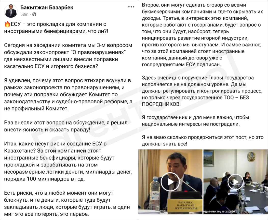 • В ноябре 2025 года депутат Бакытжан Базарбек опубликовал два видео с заседания комитета нижней палаты по законодательству и судебно-правовой реформе. На видео Базарбек почти дословно повторил слова Бапи: назвал ЕСУ лишь «ширмой», функции которой передали «российской» компании Nomapay, за которой, по словам парламентария, «стоит» Умар Кремлев и «остальные олигархи». Чиновник минспорта Казахстана подтвердил, что внедряемая система — это «адаптированный под наш рынок российский продукт», права на которую власти купили у Nomapay. По данным издания Ulus media, чиновником минспорта был глава комитета по регулированию игорного бизнеса министерства Адилет Турганбаев.