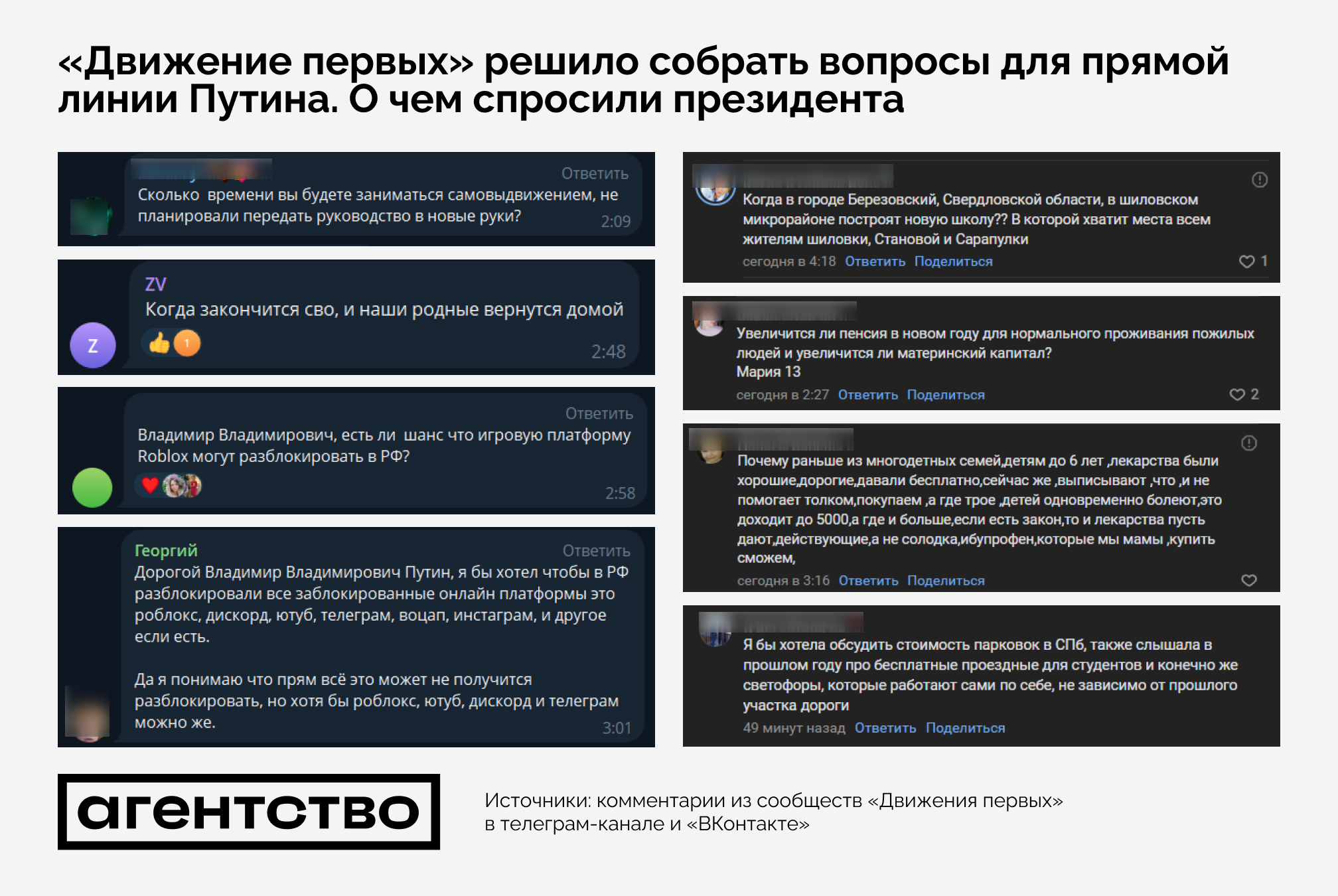 Провластная организация для детей и молодежи «Движение первых» в среду спросила у своих подписчиков в телеграмме и во «Вконтакте», какой вопрос они хотели бы задать Владимиру Путину на прямой линии. За несколько часов в комментариях появились десятки неудобных для власти вопросов — в том числе о сроках окончания войны в Украине, блокировках иностранных сервисов, проблемах с интернетом и низких зарплатах. Официальный сбор вопросов президенту идет через закрытые площадки, поэтому посты движения стали одним из немногих способов увидеть, о чем спрашивают Путина.
