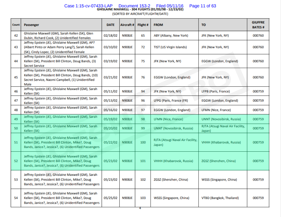 🔸После двух дней на базе Эпштейн с помощницами 22 мая улетел в Хабаровск. На борту самолета были Билл Клинтон, его помощник Даг Бэнд, а также две женщины, мужчина и неизвестный пассажир — их полные имена не называются. 23 мая тем же составом они улетели в китайский Шэньчжэнь.