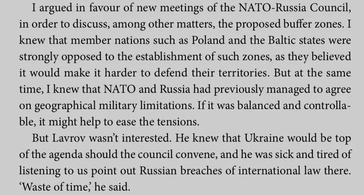 Детали. В мемуарах «На моем дежурстве: как я руководил НАТО во время войны» (On My Watch: Leading NATO in a Time of War), которые частично пересказывает издание The Baltic Sentinel, Столтенберг вспоминает личную встречу с Лавровым осенью 2021 года и признает, что, несмотря на сопротивление Польши и стран Балтии, предложил обсудить в рамках совета «Россия-НАТО» создание буферной зоны у российских границ и отвод войск альянса к позициям до 1997 года.