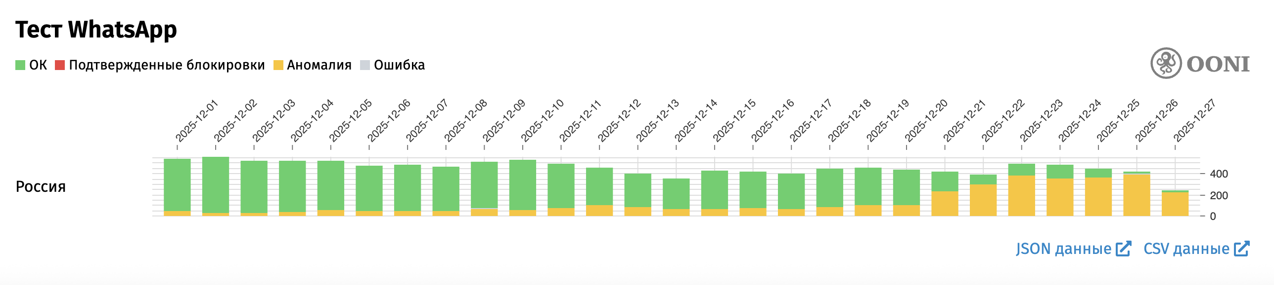 - ️Согласно платформе открытых данных об интернет-цензуре OONI Explorer, с начала недели число измерений без признаков блокировки WhatsApp резко сократилось, а в последние два дня почти все измерения фиксируют аномалии при работе с мессенджером, что является признаком блокировки.
