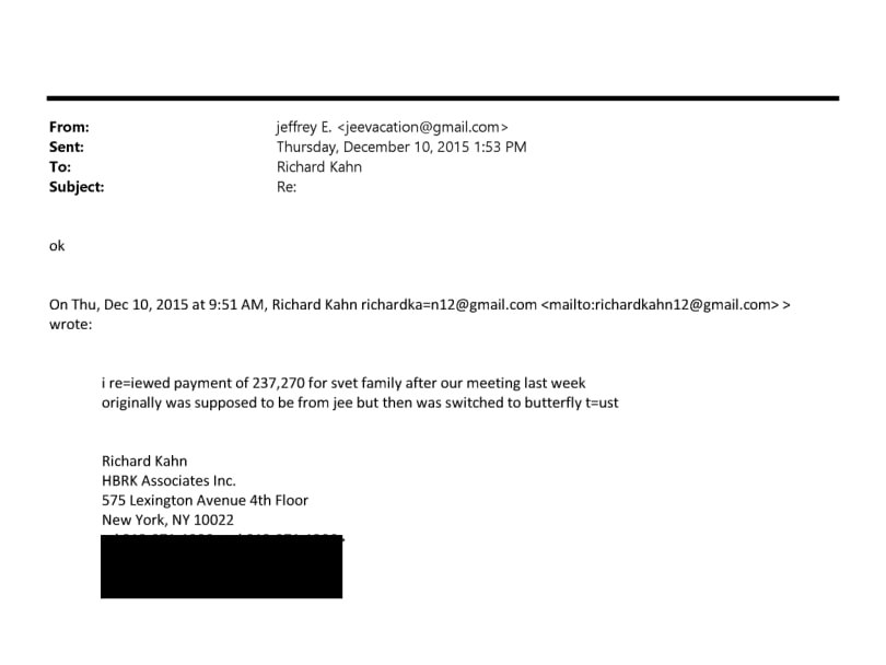 Детали. В декабре 2015 года бухгалтер Эпштейна Ричард Кан отправил финансисту электронное письмо, в котором сообщил о переводе на сумму 237 270 долларов «для семьи Светы». Такая же сумма содержится в банковской выписке о переводе от 30 марта 2015 года со счета контролируемой Эпштейном компании Butterfly Trust на счет в московском отделении Raiffeisenbank, обратило внимание The Newsground.