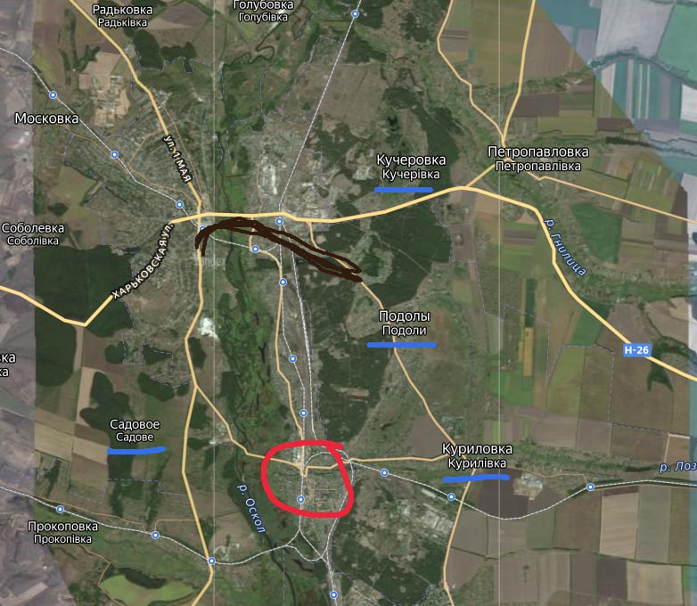 • Пророссийский телеграм-канал «Белорусский силовик» опубликовал карту, на которой провел черным цветом границу территории под контролем ВСУ и подчеркнул синим населенные пункты, которые «мягко говоря, не совсем под нашим контролем». Из карты следует, что российская армия не подошла к Купянск-Узловому.