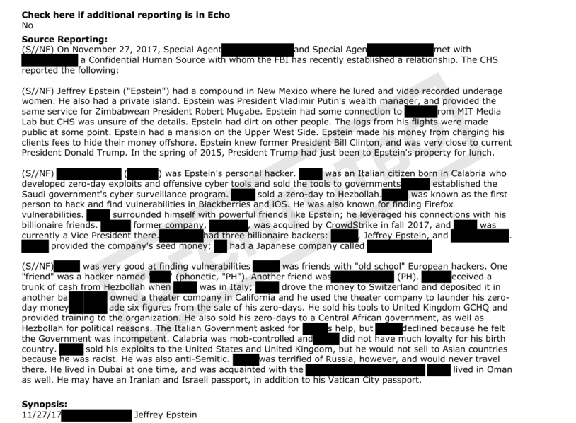 «Управляющий состоянием Путина». В отчете ФБР от 27 ноября 2017 года говорится о встрече агентов с конфиденциальным источником, который рассказал, что «Эпштейн был управляющим состоянием президента Владимира Путина и оказывал аналогичные услуги президенту Зимбабве Роберту Мугабе».