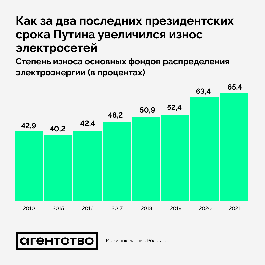 • Рост износа электросетей продолжался постоянно на протяжении двух последних президентских сроков Путина, свидетельствуют данные Росстата. Степень износа основных фондов распределения электроэнергии выросла с 40,2% в 2015 году до 65,4% в 2021-м. Подробнее об этом — в графике «Агентства».