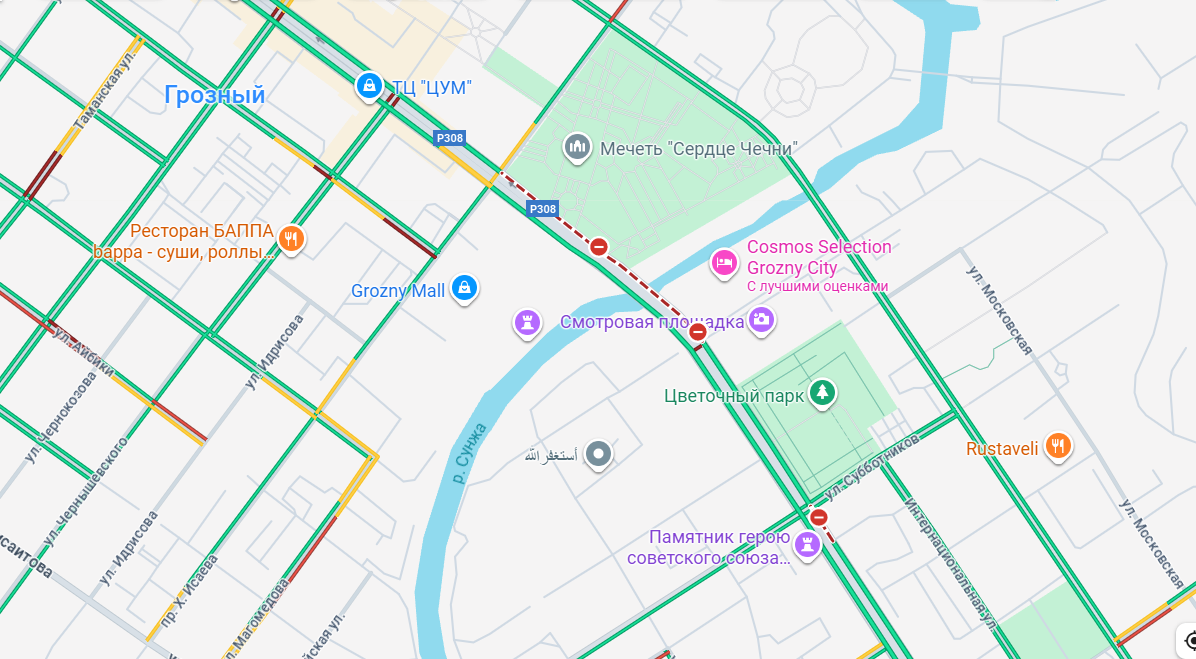 - ️Niyso уточнил, что после ДТП в городе были перекрыты дороги. Google Maps, который использует в том числе информацию от пользователей, фиксирует факт перекрытия нескольких участков вдоль проспектов Кадырова и Путина в самом центре города, недалеко от мечети «Сердце Чечни» (скриншот ниже). «Яндекс.Навигатор» и 2gis об этих перекрытиях не сообщали, однако журналист «Агентства» видел в этом районе пробки несколькими часами ранее.