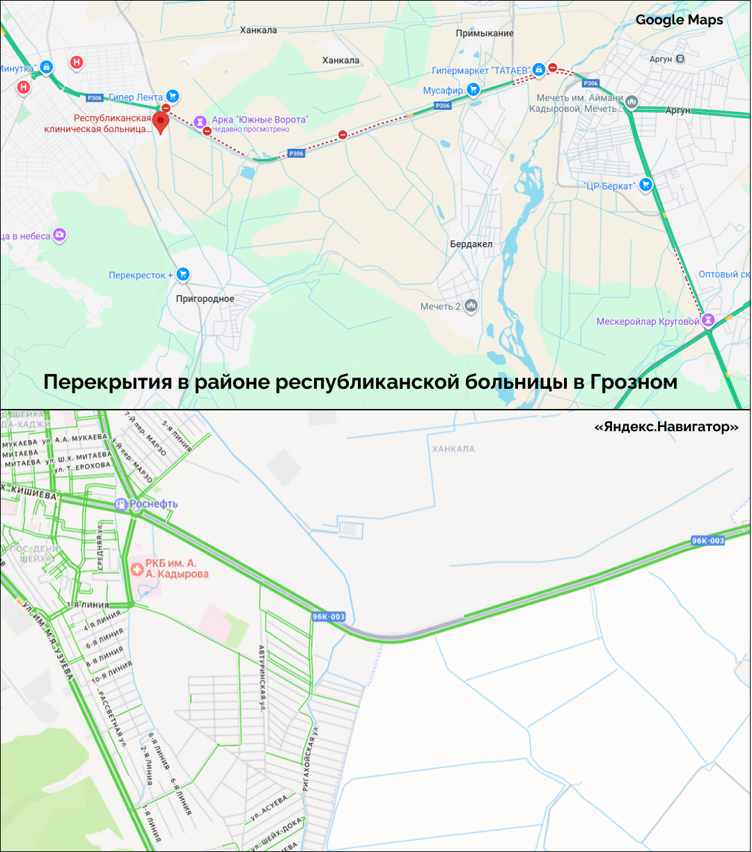 - ️Перекрыта была и расположенная рядом с больницей трасса из Аргуна в Грозный, сообщил Niyso. В подтверждение блог выложил видео из пробки, сделанное рядом с въездным знаком в Грозный — на нем скорая проехала в сторону города и больницы. О перекрытиях в этом районе писали и «Кавказ.Реалии». Google Maps к 22:00 зафиксировал сразу три участка с ограничением движения на трассе до Аргуна, четвертое — на дороге от Аргуна до Мескер-Юрта. «Яндекс.Навигатор» около 23:00 выделял серым один из участков недалеко от больницы — это означает, что у сервиса нет данных о ситуации на нем (скриншот ниже).
