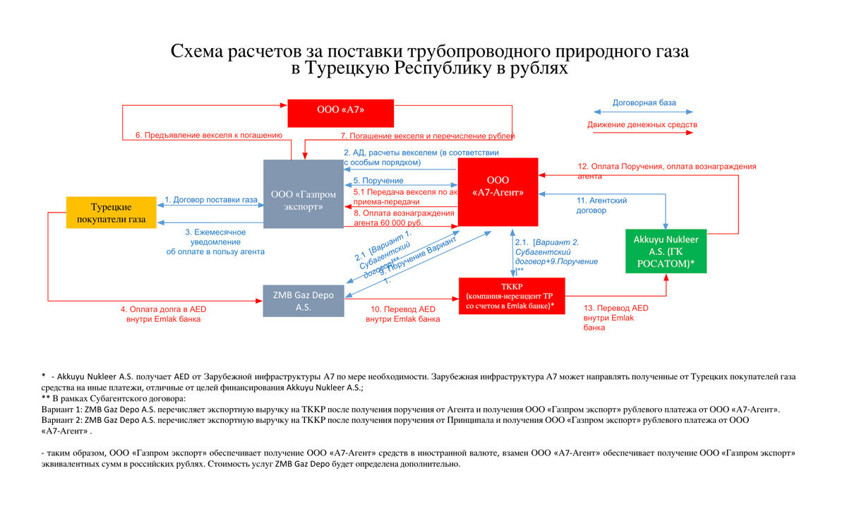 Детали. Как следует из утечки внутренних документов А7, схема оплаты за российский газ может выглядеть так. Турецкие компании-потребители переводят деньги на счет дочки «Газпрома» (ZMB Gaz Depo A.S.) в турецком государственном банке Emlak. Оттуда они поступают на счет учрежденной киргизским правительством «Торговой компании Кыргызской Республики» (ТККР) в этом же банке. Часть денег ТККР отправляет «по мере необходимости» турецкой дочке «Росатома» (Akkuyu Nukleer A.S.) на строительство АЭС, остальные попадают на счет «Газпрома» через сложные офшорные схемы. ТККР — ключевое звено в сделках А7.