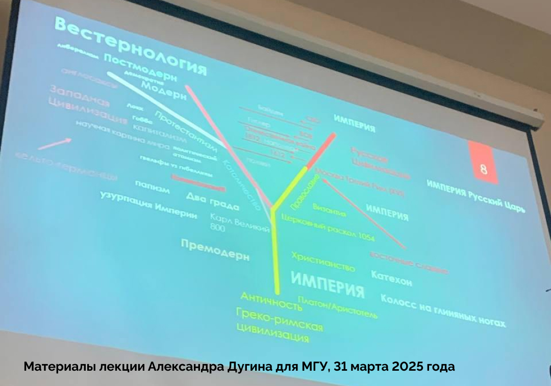 Что было у Дугина? Высказывания Харичева находятся в русле лекции Александра Дугина, прошедшей на факультете политологии МГУ в марте 2025 года. Тогда философ также говорил о расколе единой цивилизации в 1054 году. При этом график, показанный Харичевым, почти полная копия графика из материалов той лекции Дугина.