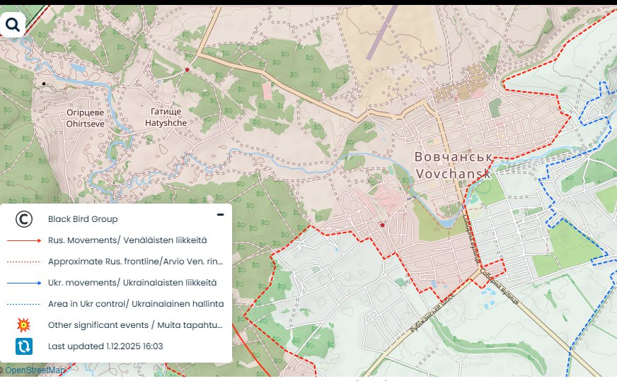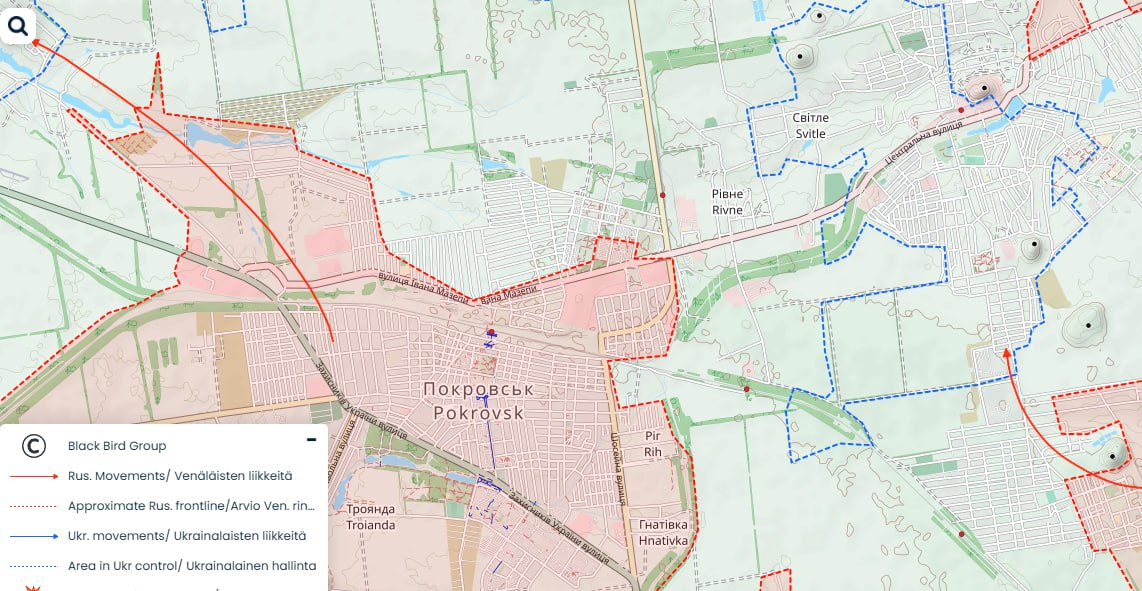 - Не подтверждает полный захват Покровска и Волчанска и карта финского OSINT-проекта BlackBirdGroup.