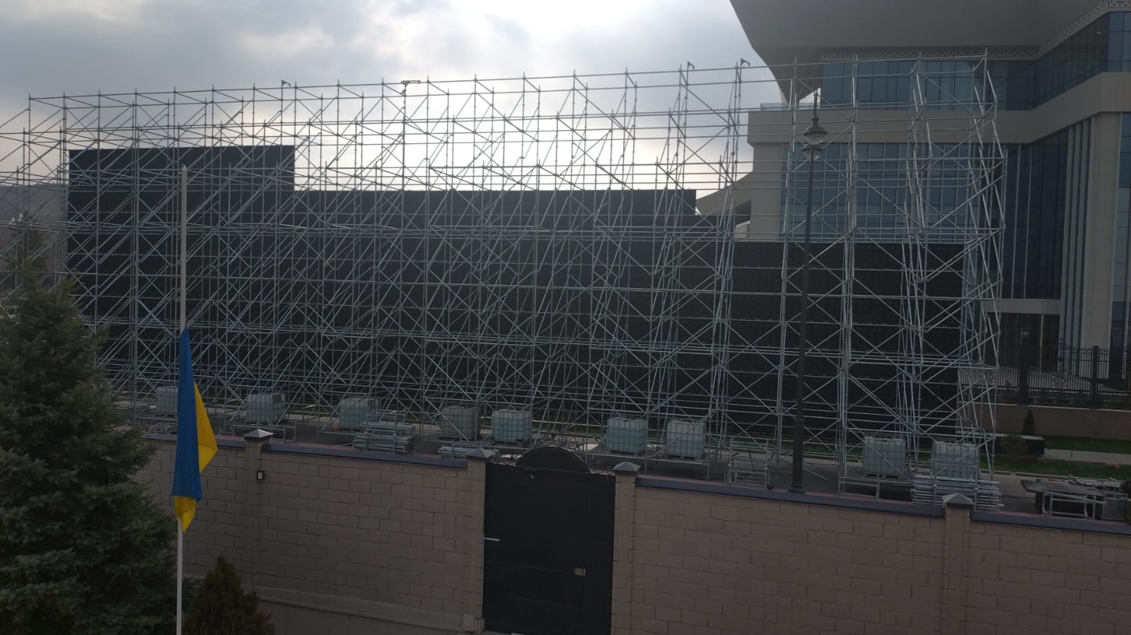 - Еще до визита Путина в Бишкек рядом с площадью перед президентской официальной резиденцией Ынтымак Ордо возвели каркасный экран, который закрыл вид на находящееся в 200 метрах от него посольство Украины, обратил внимание журналист Григорий Пырлык. Советник посла Украины в Кыргызстане Денис Автономов отказался комментировать установку конструкции, но отметил, что «причинно-следственная связь, очевидно, определенная есть».