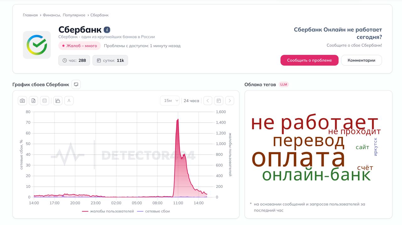 - ️За сутки на работу Сбера оставили больше 10 тысяч жалоб, следует из данных сервиса Downdetector. Пик жалоб пришелся на 11:00 по мск (1467 жалоб). На работу «Т-Банка» за сутки пожаловались больше 1400 раз. О проблемах также сообщали клиенты «Альфа-банка» (172 жалобы за сутки), Совкомбанка (303), Промсвязьбанка (122), ВТБ (202) и Газпромбанка(113), СБП.