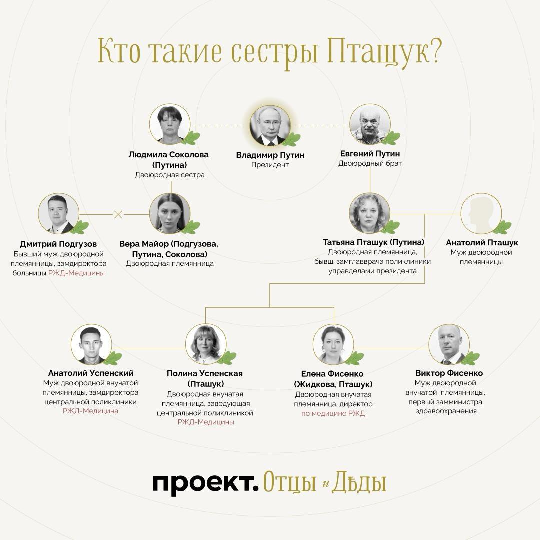 На руководящих должностях в компании «РЖД-Медицина» работают не менее четырех членов семьи президента, выяснило «Агентство». О двух из них, внучатой двоюродной племяннице Полине Успенской и ее супруге Анатолии, до сих пор не было известно. Полина много лет занималась косметологией, а сейчас она — заведующая центральной поликлиникой РЖД. Начальница Полины, руководитель всей «РЖД-медицины» — ее же младшая сестра Елена Фисенко. Замдиректора одной из больниц сети — теперь уже бывший муж двоюродной племянницы Путина по другой линии Дмитрий Подгузов.