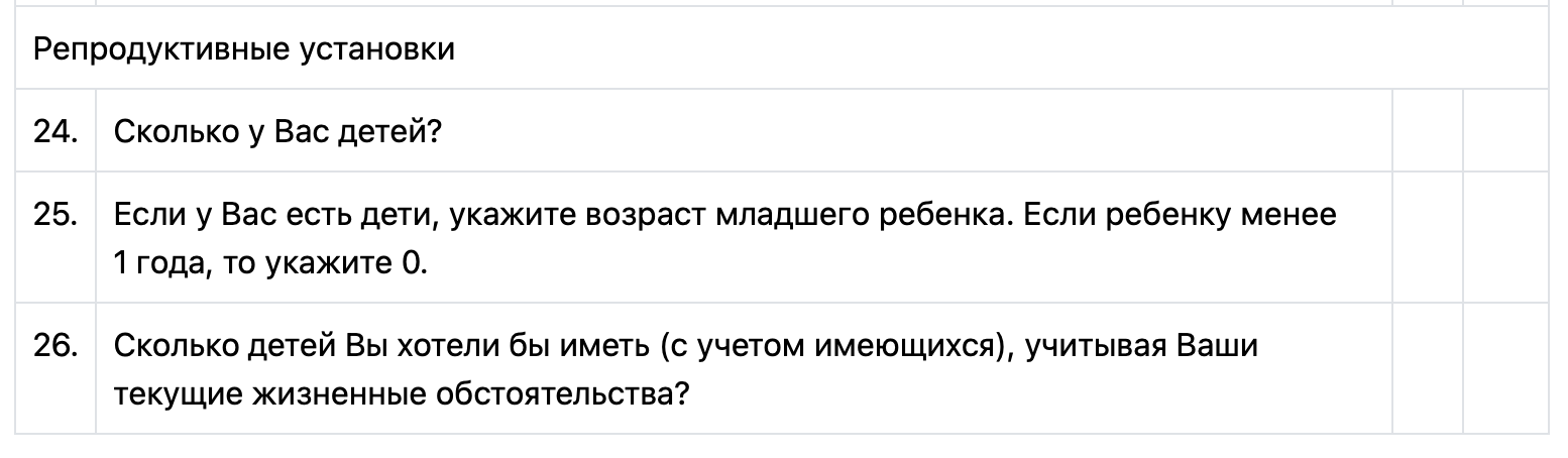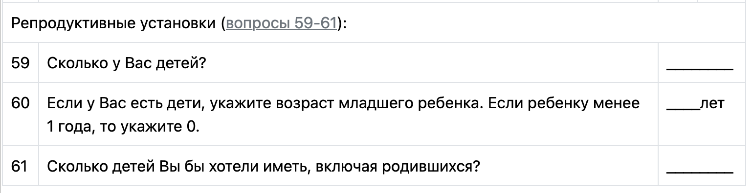 - ️В анкете для женщин 61 вопрос, в том числе три из посвящены репродуктивным установкам. В них женщин спрашивают, есть ли у них уже дети и сколько лет младшему ребенку, а также сколько всего детей они хотели бы иметь. Последний вопрос сформулирован так: «Сколько детей Вы бы хотели иметь, включая родившихся?».
