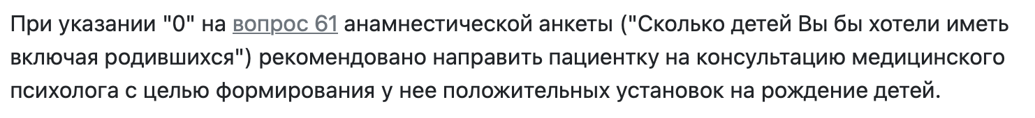 - ️Если женщина ответит на этот вопрос «0», то врачам рекомендуется направить пациентку «на консультацию медицинского психолога с целью формирования у нее положительных установок на рождение детей».