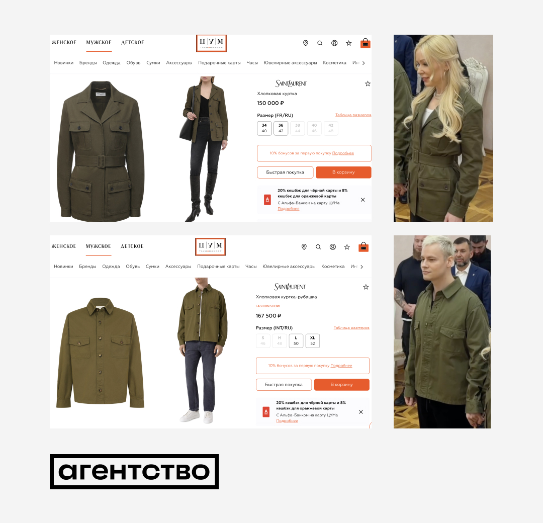 Глава «Лиги безопасного интернета» Екатерина Мизулина вышла замуж за певца Shaman (Ярослав Дронов) в хлопковой куртке от премиального французского бренда Yves Saint Laurent стоимостью 150 тысяч рублей. Шаман для церемонии, вероятно, выбрал куртку-рубашку того же бренда стоимостью больше 160 тысяч рублей. Внешне обе куртки похожи на военный камужляж.
