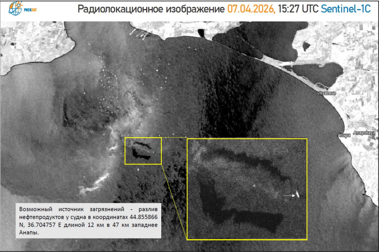 Контекст. В ночь на понедельник снимки спутника Sentinel-1 зафиксировали нефтяное пятно площадью 117 кв. км в районе Анапского залива в 10−14 км к северо-западу от Анапы. Согласно анализу снимков, который провела группа экологов под руководством Алексея Книжникова, объем разлитых нефтепродуктов оценивается в 300−350 тонн.