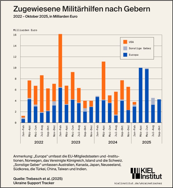 - Помощь Киеву сократилась после рекордного уровня поддержки Украины со стороны европейских стран в начале года. В сентябре и октябре Европа выделила Украине около 4,2 млрд евро военной помощи, свидетельствуют данные Ukraine Support Tracker. При сохранении нынешней динамики европейской помощи ее будет недостаточно для того, чтобы Киев смог компенсировать потери от сокращения поддержки со стороны США, говорится в сообщении института.