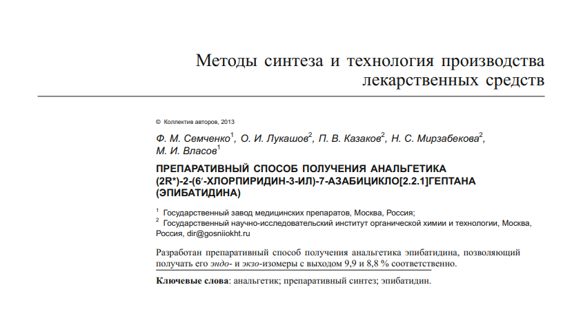- На сайте ГосНИИОХТ, одной из ключевых исследовательских организаций по разработке боевых отравляющих веществ в СССР, упоминается статья об эпибатидине, обнаружило «Агентство». Она вышла в «Журнале аналитической химии» в 2015 году. В аннотации к публикации уточняется, что авторы — сотрудники ГосНИИОХТ. В статье рассказывается о методике обнаружения в плазме крови эпибатидина.