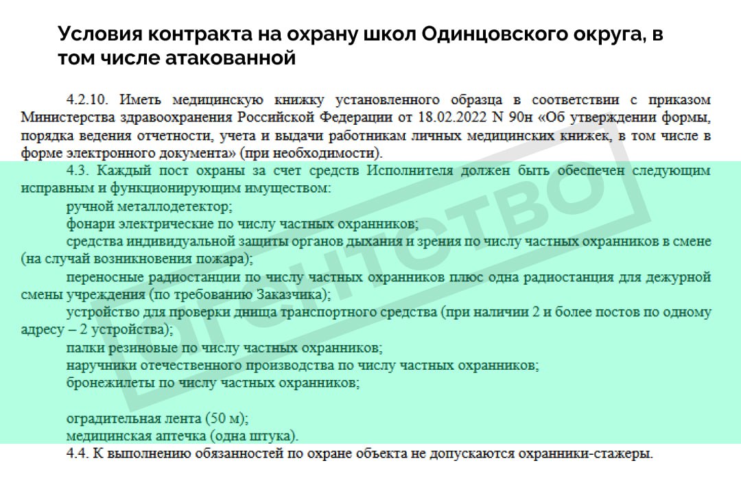 • За охрану Успенской школы в 2025 году ЧОП должен получить 3,7 млн рублей, следует из контракта. За эти деньги в школе нужно было организовать пост охраны, на котором должны работать два охранника. Компания должна была обеспечить пост ручным металлодетектором и устройством для проверки днища, а охранников — резиновыми палками, наручниками, бронежилетами, фонарями, переносными радиостанциями и индивидуальными средствами защиты органов дыхания и зрения.
