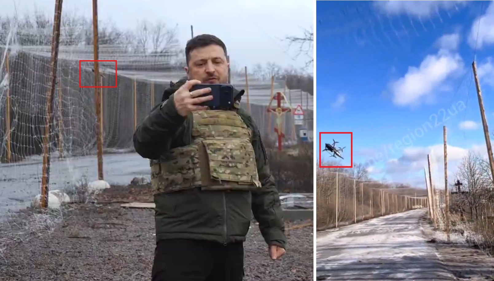 - Запутавшийся в противодронной сети беспилотник. И на видео Зеленского видно запутавшийся в противодронных сетях беспилотник. Его же видно в ролике, который сняли у стелы день спустя украинские военные, которые проехали на машине к месту съемки видео Зеленского.