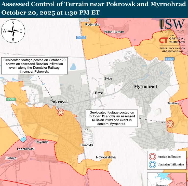 - Геолоцированные кадры, опубликованные 20 октября, демонстрируют удары ВСУ по российским позициям в восточной части Покровска и вдоль железнодорожной линии в центре города, сообщил ISW. Украинский 7-й корпус быстрого реагирования десантно-штурмовых войск в понедельник опубликовал видео ударов по российским военным на городском железнодорожном вокзале. Согласно заявлению украинских военных, российские диверсанты в Покровске убили несколько мирных жителей.