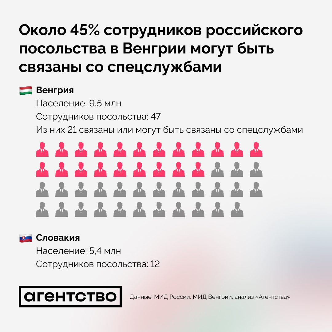 Из 47 сотрудников посольства России в Венгрии 15 связаны с различными российскими спецслужбами, а еще шестеро могут иметь связи с ними, выяснило «Агентство». Вовлечение спецслужб в работу российского дипведомства в Венгрии выше, чем в Бельгии, где находится штаб-квартира НАТО и офисы ряда органов ЕС. Это может свидетельствовать о повышенном внимании Кремля к Венгрии, где в эти выходные пройдут парламентские выборы.