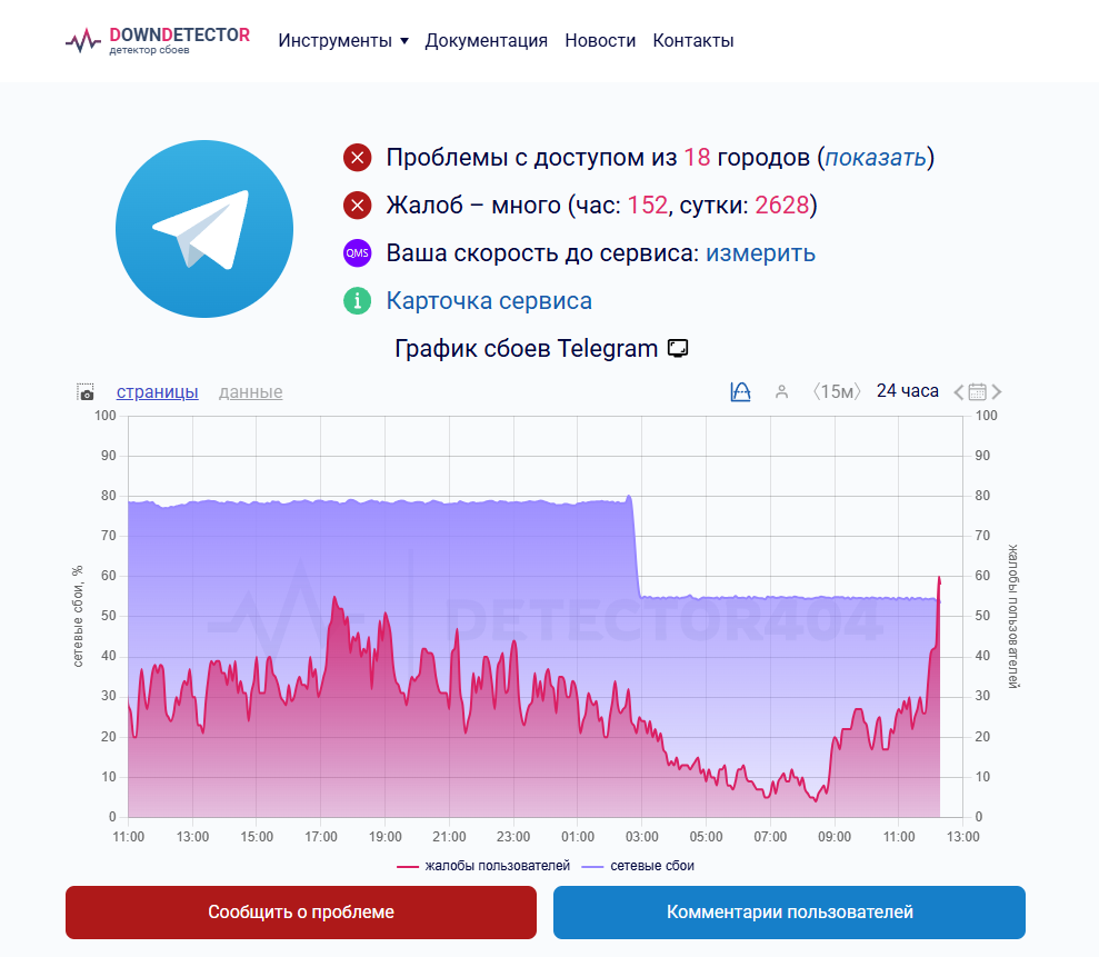 • Другой сервис отслеживания жалоб на работу рунета Downdetector за последние сутки зафиксировал 2,6 тысячи жалоб. При этом по данным Downdetector, уровень сетевых сбоев HTTP (S) после полуночи снизился с 78 до 55%.