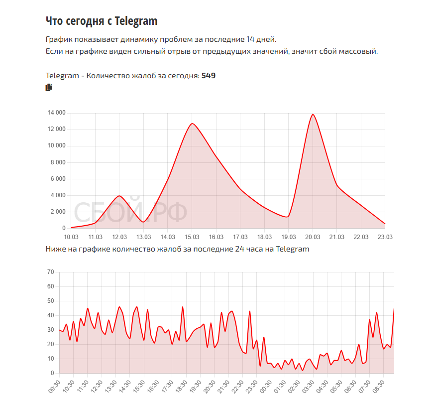 • В сервисе «Сбой.рф» количество жалоб на работу Telegram снижается с пятницы, когда за сутки пользователи пожаловались на проблемы в работе мессенджера 13,8 тысячи раз. В субботу — 5,2 тысячи, в воскресенье — 2,7 тысячи. К 9:30 понедельника сервис зафиксировал 549 жалоб.