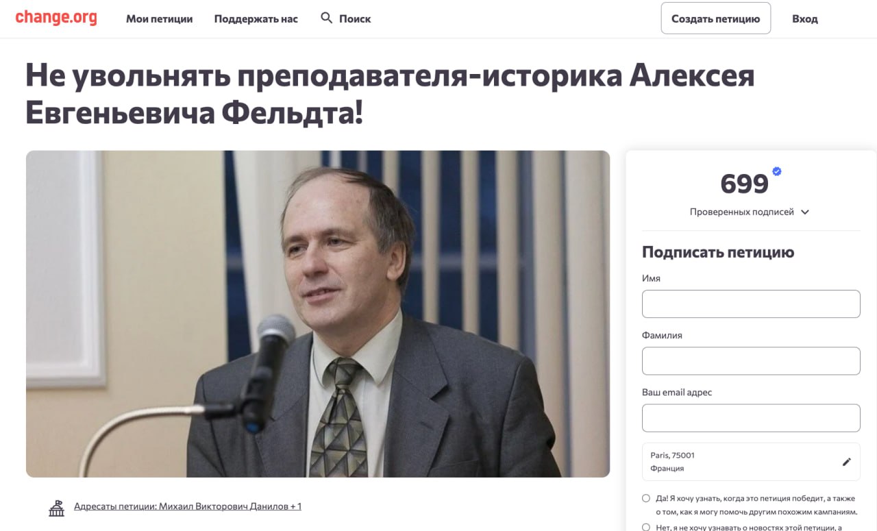 - ️В поддержку Фельдта выступили и студенты. В ВК появились публикации под хэштегом #нельзяуволитьфельдта. Петицию против его увольнения на Change.org подписали почти 700 человек.