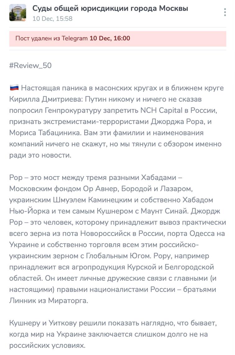 В официальном телеграм-канал судов общей юрисдикции города Москвы появился конспирологический пост, рассказывающий о «панике в масонских кругах и в ближнем круге Кирилла Дмитриева» из-за того, что Владимир Путин якобы попросил Генпрокуратуру запретить NCH Capital в России. Пост быстро удалили.