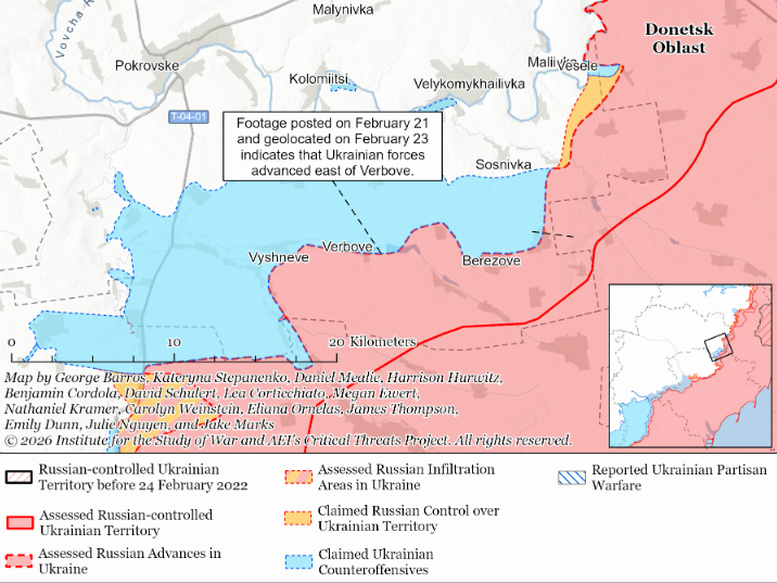 - Замедление продвижения России продолжается с начала февраля: со 2 по 8 февраля российские войска заняли 53 кв. км после 90 кв. км неделей ранее, с 9 по 15 февраля — 28 кв. км (худший результат за 10 месяцев).